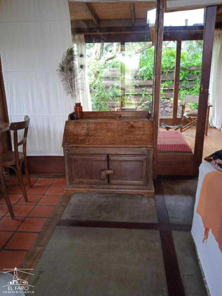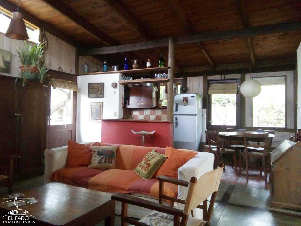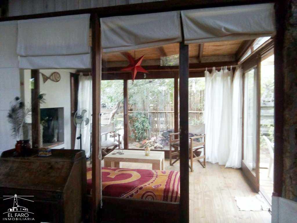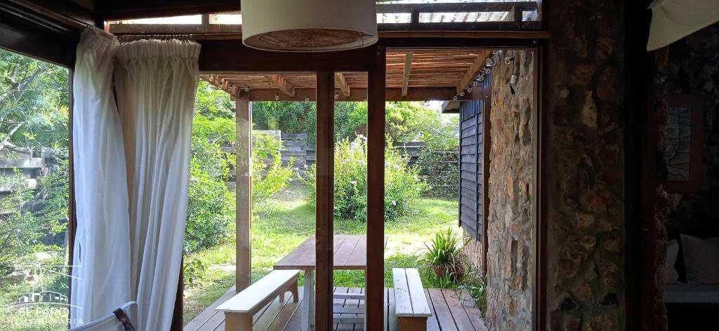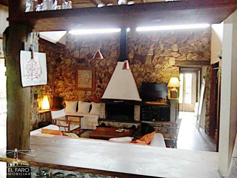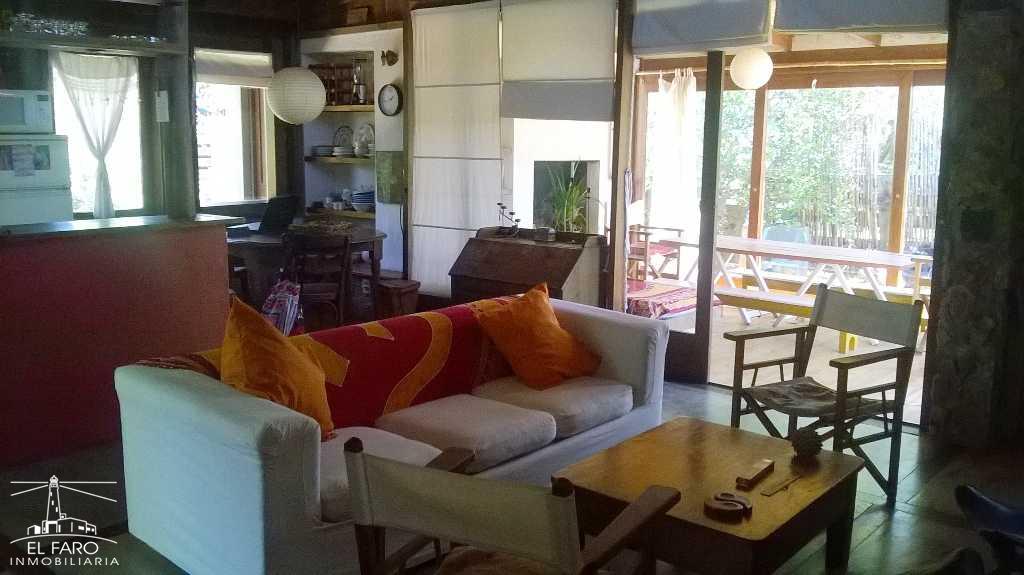 Living comedor y cocina integrados, con puerta ventana que accede a un estar tipo jardín de invierno con parrillero y conexión al fondo y fogón de piedra. Sofá cama.