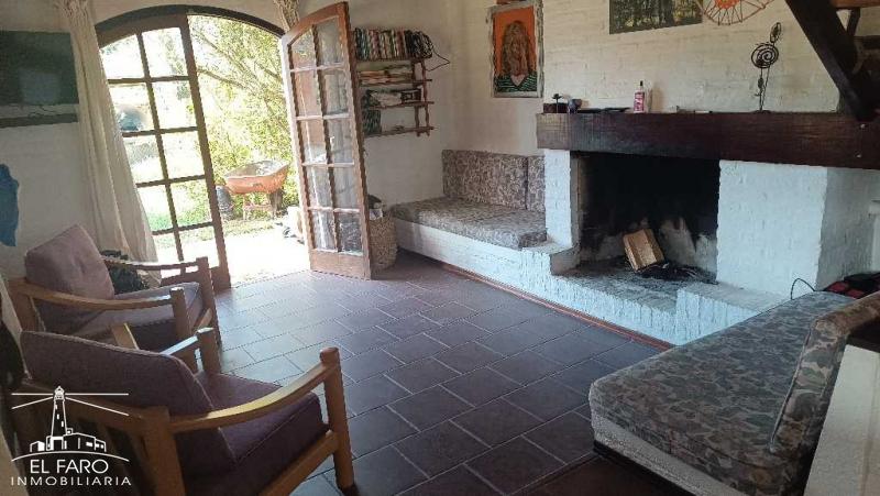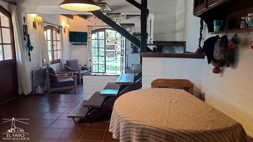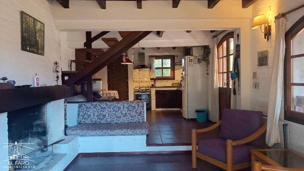 El living es en desnivel con estufa a leña con puerta ventana con salida al jardín y otra a amplio alero lateral.