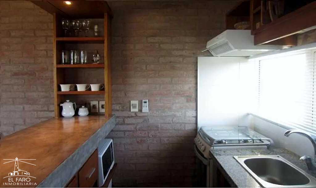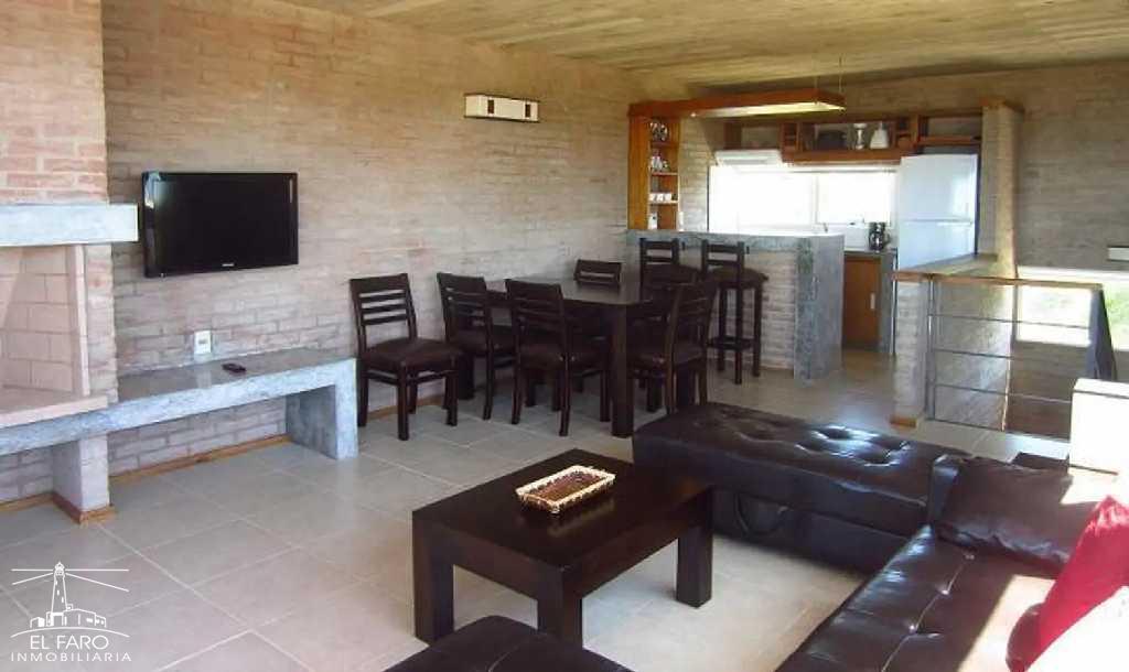 En planta alta: estar comedor con cocina integrada en cómodo ambiente con barra; en zona de estar sillón en simil cuero con chaise long convertible en cama doble. Estufa a leña. Aire acondicionado.