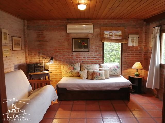 Acogedora casa de 2 dormitorios y dos baños con camas adicionales en área del living.