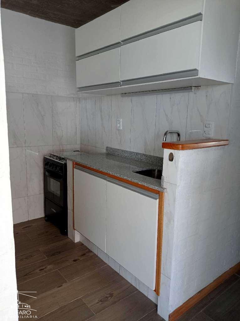 Living comedor con estufa de alto rendimiento, cocina y baño.