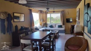 Acogedora casa de 2 dormitorios y dos baños con camas adicionales en área del living.