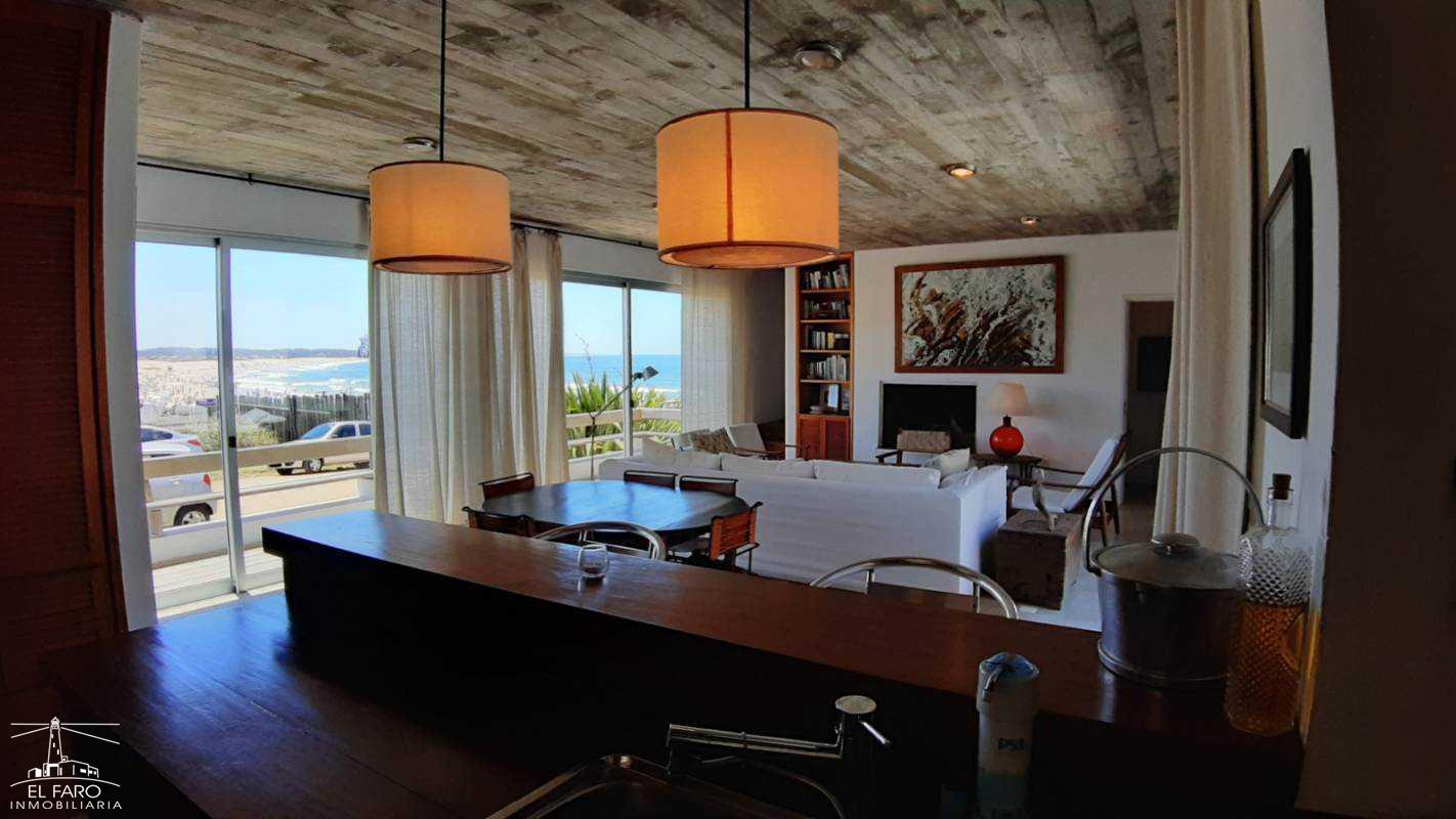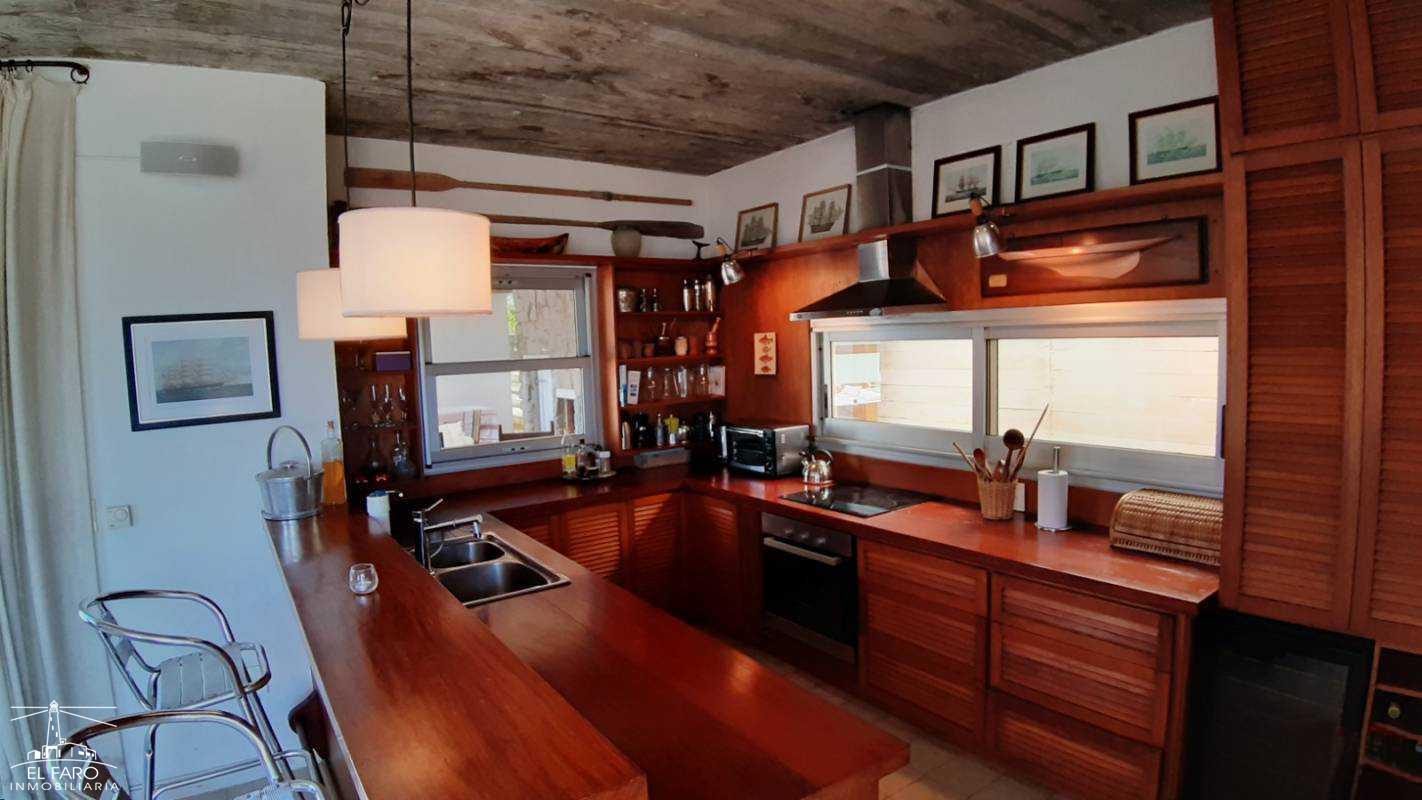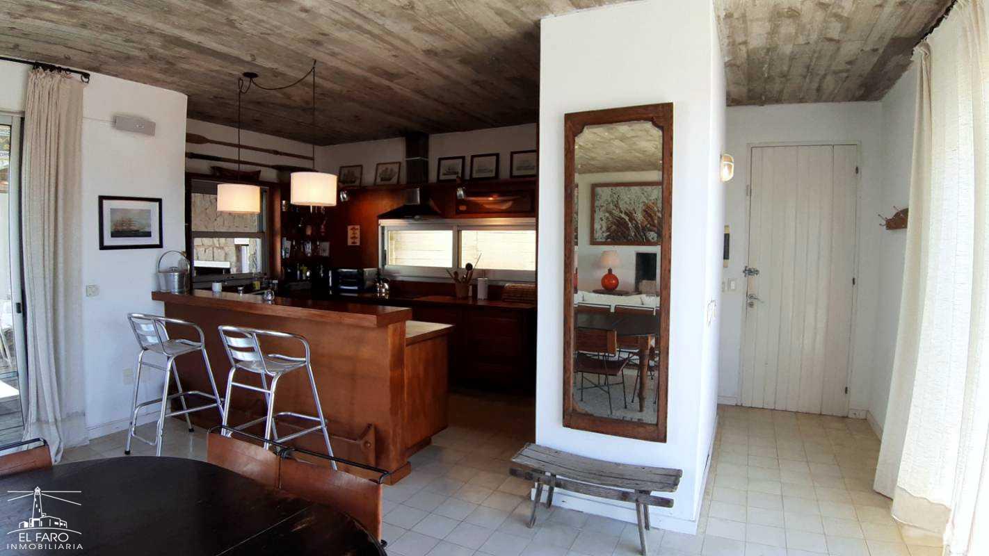 En el módulo al frente de la casa en planta baja hay un amplio living comedor con la cocina integrada, con estufa a leña, y toilette, con amplias puertas ventanas tanto al frente con vistas al mar, como al patio interior intergrando ambos ambientes.